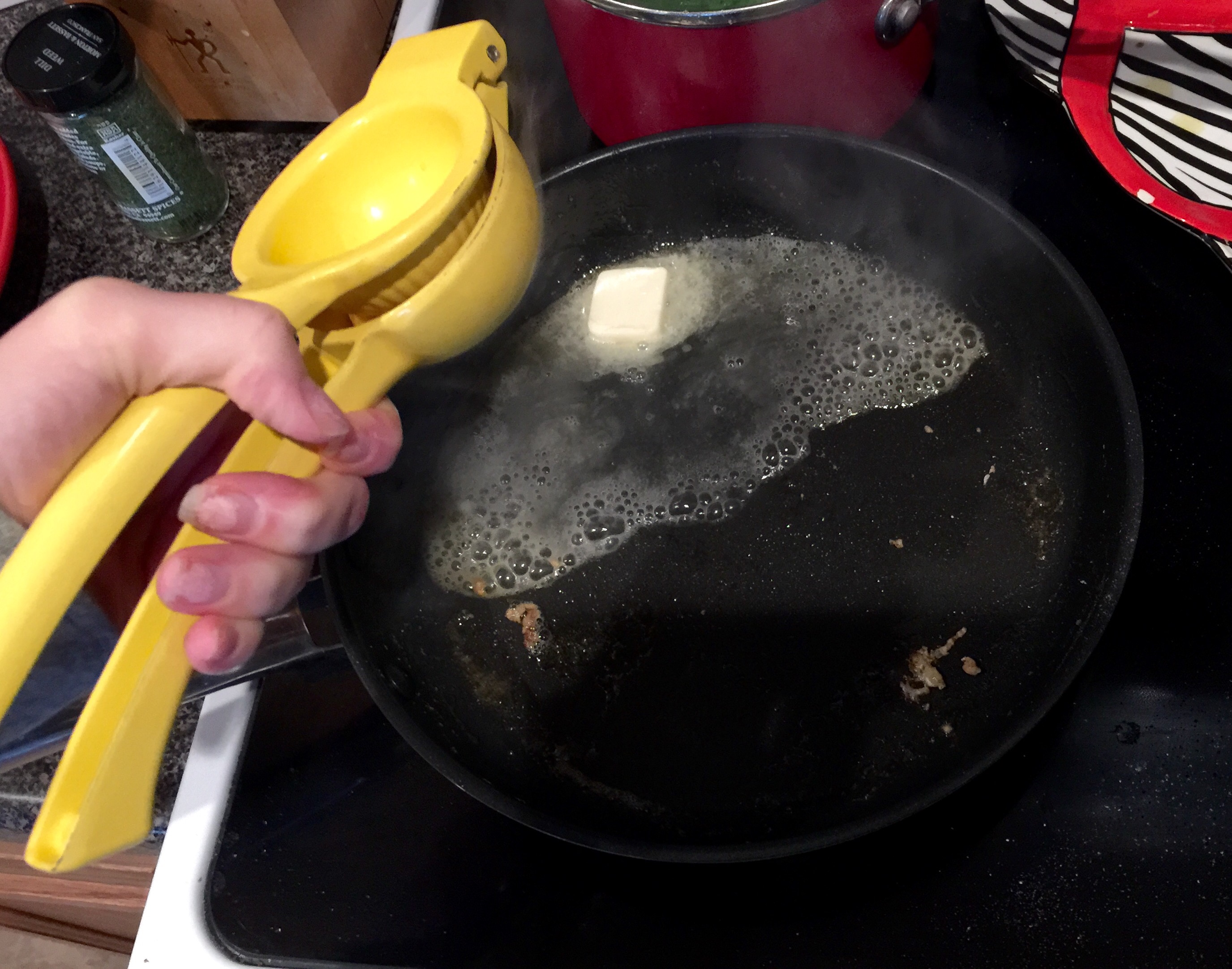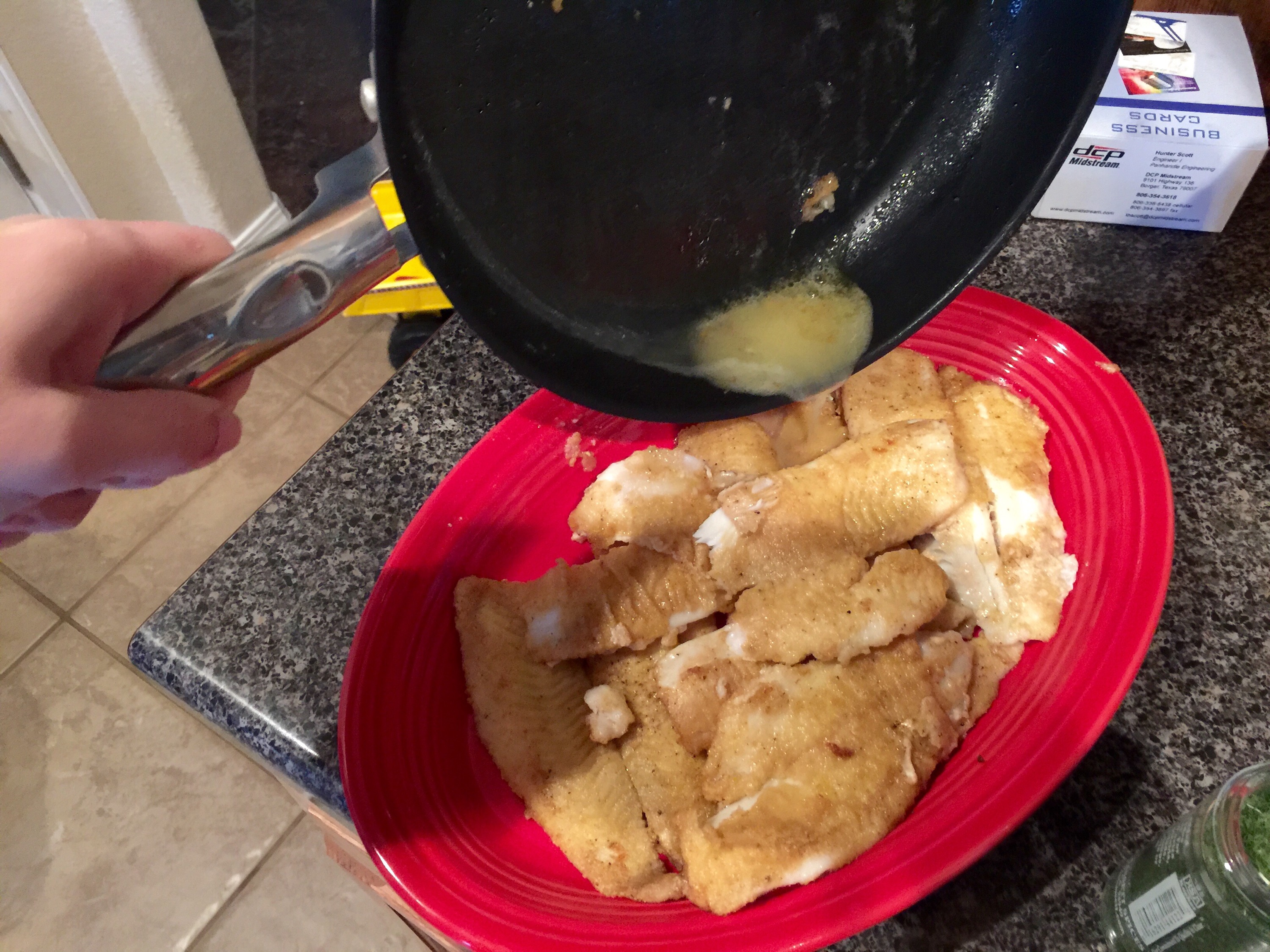 3. Set your fish aside on your serving platter once it’s all done cooking. Then add 1 T butter and the juice of a lemon to your pan and stir around about a minute. Then pour lemon butter over flounder filets.