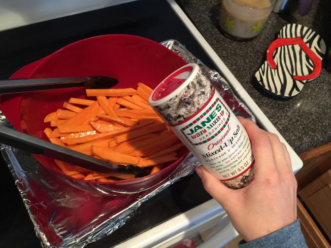 2. Drizzle olive oil all over the fries, then season with your favorite salty seasoning (or even just kosher salt) and toss together so the fries are all coated.
