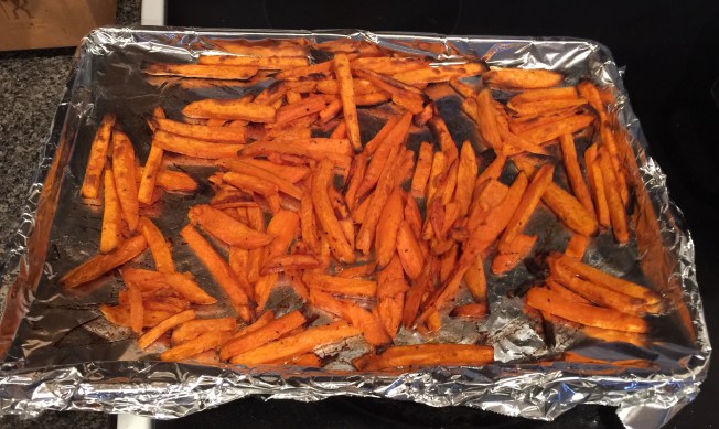1. Peel and cut up your sweet potatoes into the fry thickness you desire. Use a very sharp knife, because they’re hard to cut through. I’ve broken three fry cutters that swear they’ll cut sweet potatoes, so just get out your knife sharpener if you need to.