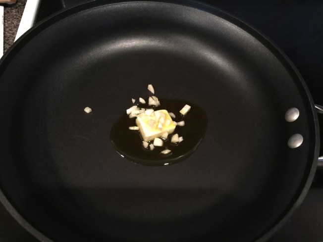 1. First add butter and oil into your largest sauté pan. Also add your chopped garlic and turn on medium high heat.