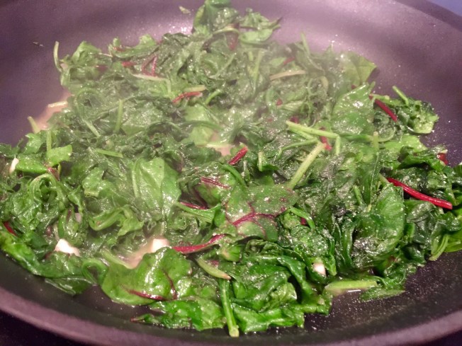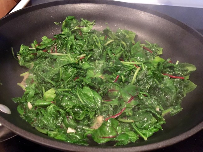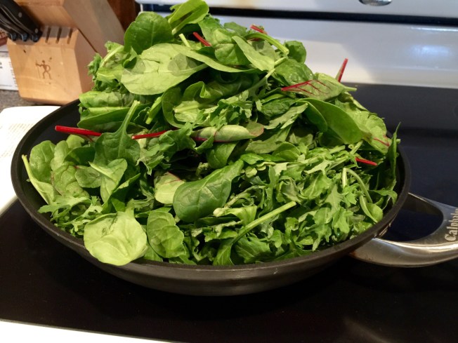 3. I know it looks like waaaay too much food for the pan, but trust me, it’s going to wilt into practically nothing! This is seriously a serving for two people. You’re going to stir it around every little bit to help the cooked leaves get to the top so newer ones can wilt down too. Watch.