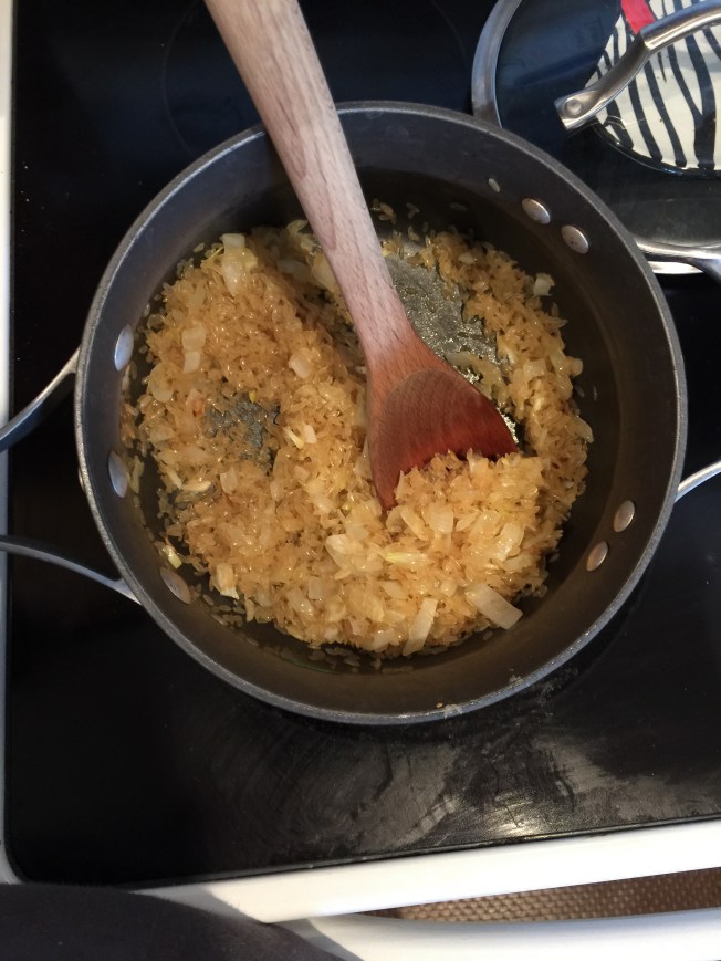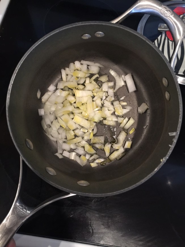 1. Put your sweet onion into a pot and drizzle some olive oil on them. Season with salt and pepper and cook for s few minutes on medium high heat. You’re just going to sweat them out a little bit.
