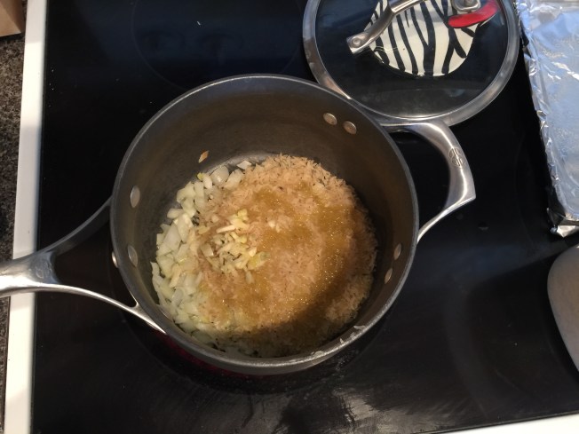2. Now add your rice and chopped garlic into the pot. Also drizzle additional oil onto the rice, as you’ll be “stir frying” it for a few minutes. Do not walk away from your pot right now – this burns easily! Cook for 2-3 minutes stirring frequently.