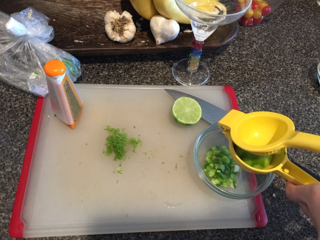 1. Chop your green onion and put half in a small bowl with your lime juice, lime zest, honey, a pinch of salt, and olive oil. Save the other half of the green onion for garnish. Wisk the marinade together. Give your marinade a taste and see if you want to add more honey or salt.