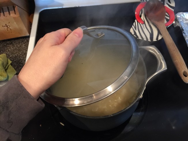 3. Now add the zest of your lime, the juice of the lime, the 1/2 chicken bullion cube either chopped or crushed between your fingers, and water to the pot. Bring to a boil for one minute, then put a lid on it and turn the heat down to simmer.