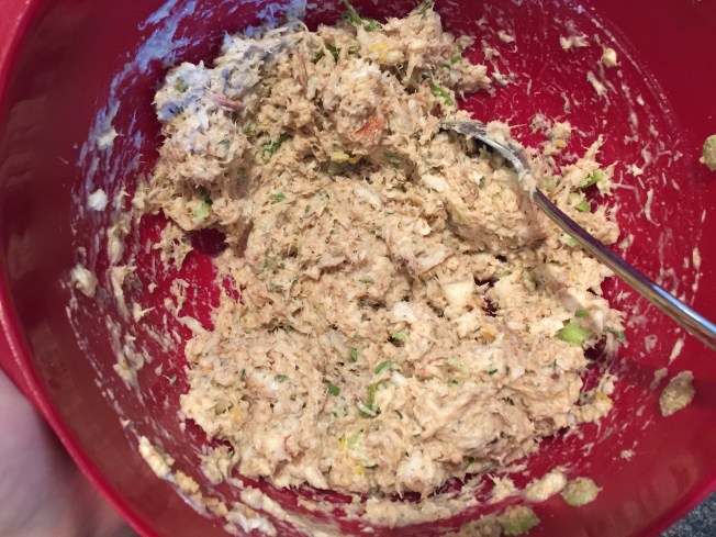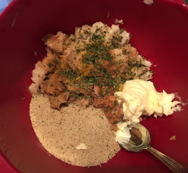 1. Flake your fish apart with two forks and combine fish, crab meat, and the rest of the ingredients together in a mixing bowl.