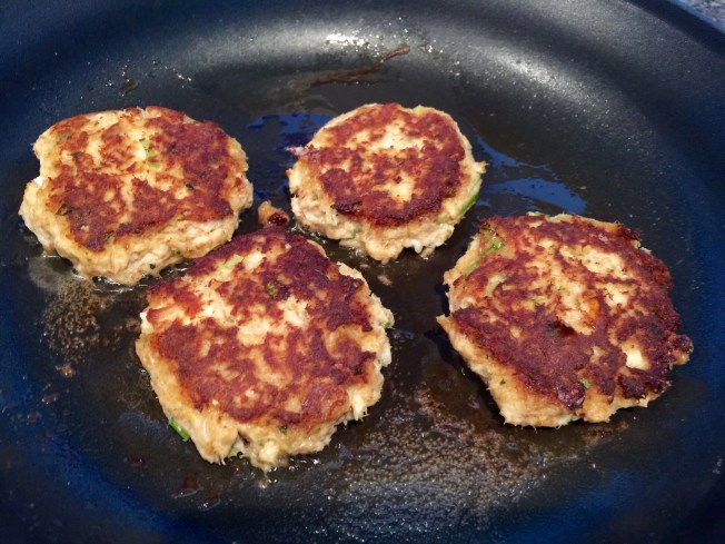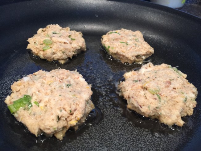 4. I like to cover my cakes with plastic wrap and chill for at least 20-30 minutes to let them firm up because they’ll cook easier and stay together better. It’s not 100% necessary, but I recommend it. Once they’ve been chilled, melt 1 T butter in a large skillet and add your crab cakes. Don’t overcrowd the pan!