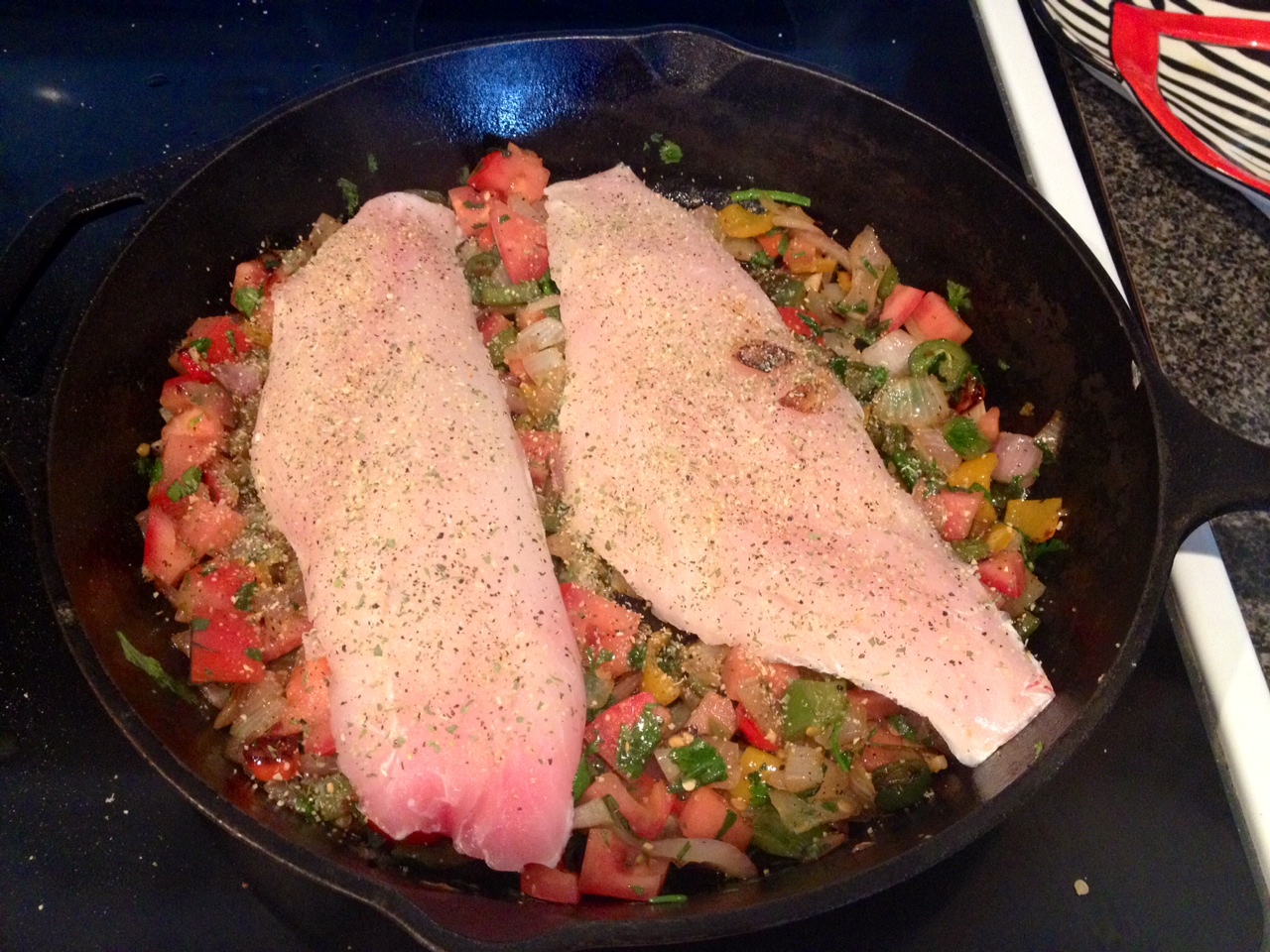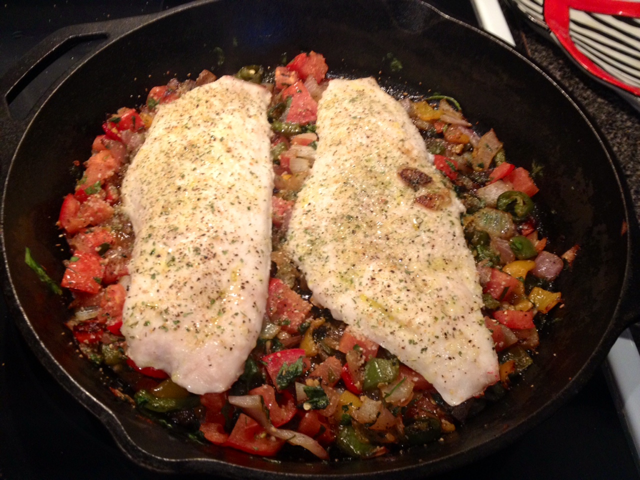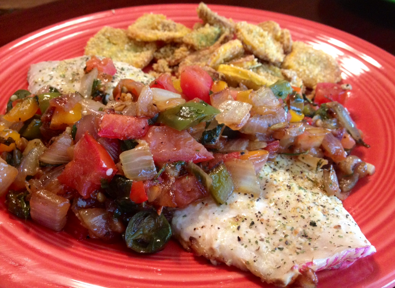 I love fish! There are so many people that tell me they love fish but that they’re scared to cook it or all they know how to do is fry it. Don’t get me wrong, I love fried fish, but there are so many healthier and just as delicious ways to enjoy our friends from the salty sea. This red snapper is a very mild white fish, and if you can’t find snapper where you are, a similar tasting fish would be grouper, flounder, or another mild white flaky fish. Halibut is delicious too, but it’s usually an arm and a leg, and I like to stick with the affordable stuff! Normally I do sort of a cooked pico de gallo recipe with this fish, but I had some bell peppers in my garden that were ready to pick, so those got incorporated into this dish and I was so happy I put them in there!